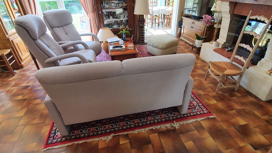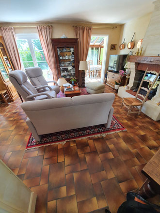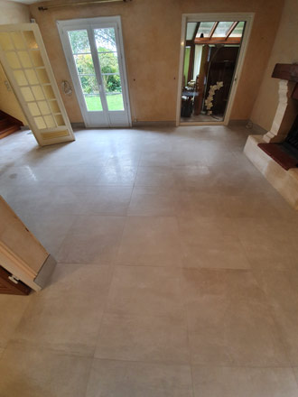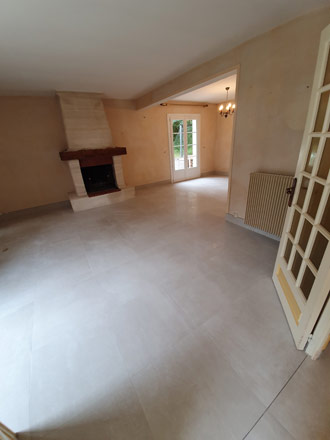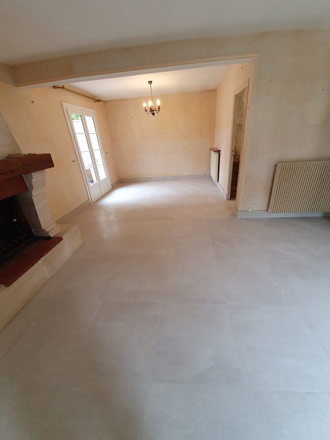 La hauteur sous les baies de cette maison nous a permis de pouvoir poser un 60x60cm sur le carrelage existant. Nous avons déposé les anciennes plinthes de 10cm de haut et nous avons fait façonner des plinthes sur mesure à la même hauteur que les anciennes afin d'avoir un rendu esthétique. Les clients n'ont pas eu besoin de refaire toutes les tapisseries de la maison. Nous sommes à l'écoute de vos demandes et sommes prêts à faire de votre projet un projet unique !
