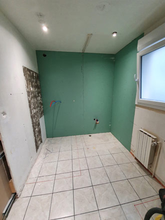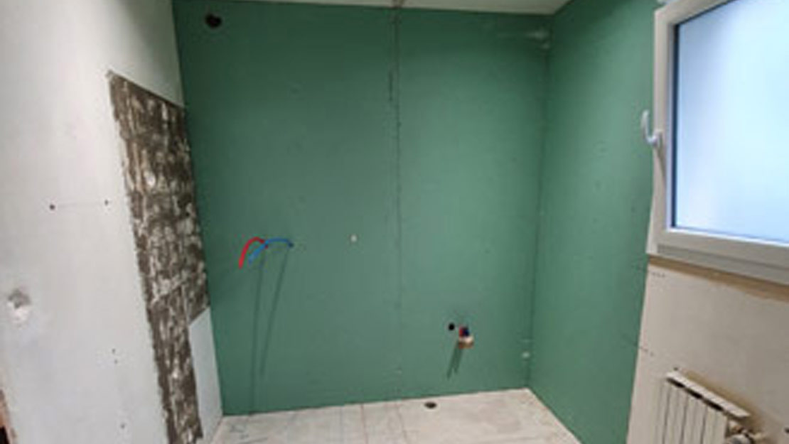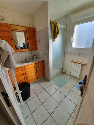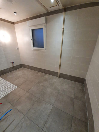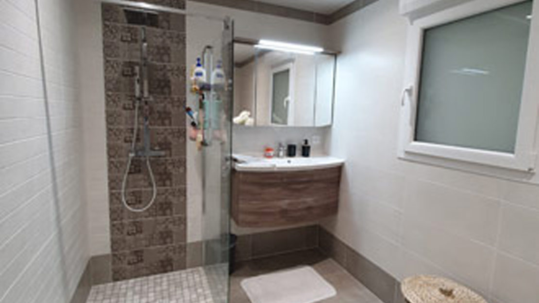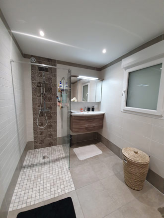 Lors de la rénovation de cette salle d’eau, nous avons réagencé la pièce et créé une douche à l’italienne confortable. Une faïence a été choisie avec goût pour moderniser cette grande salle d’eau. La faïence en relief vient délimiter le coin douche avec une colonne axée en carreaux décors pour mettre en valeur la robinetterie.