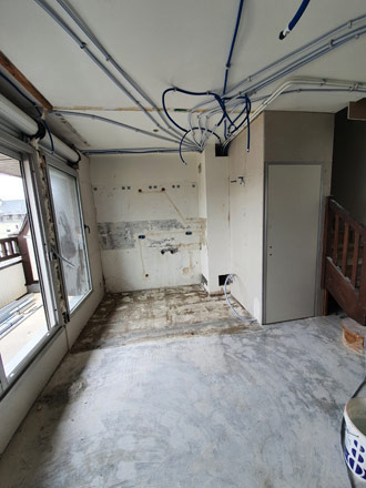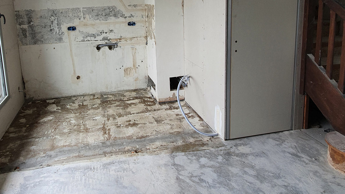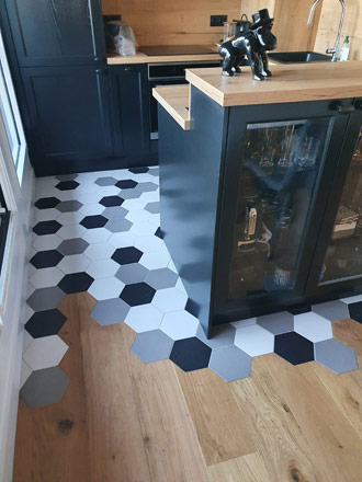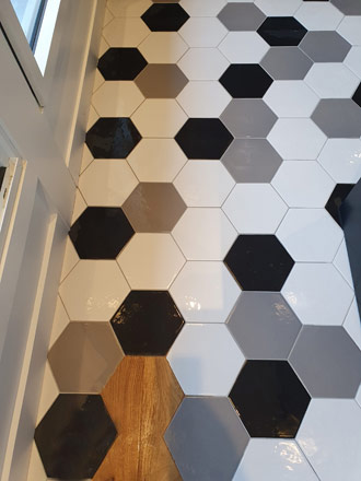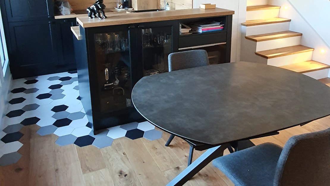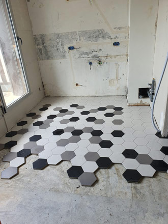 Nous avons posé un carrelage hexagonal noir, blanc et gris. Nous l'avons incorporé dans une pose d'effet bois. Ce mariage de couleur et de matière est très réussi ! Osez ces alliances très tendances !