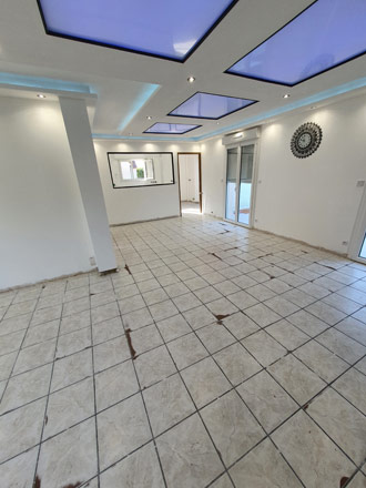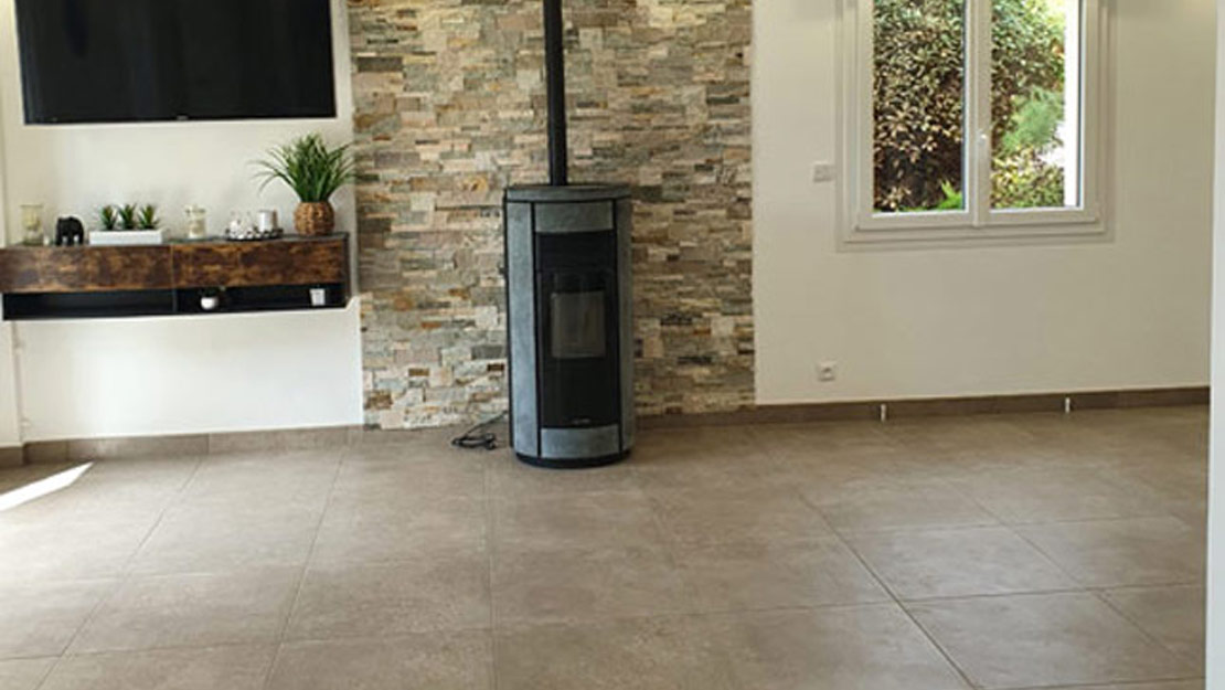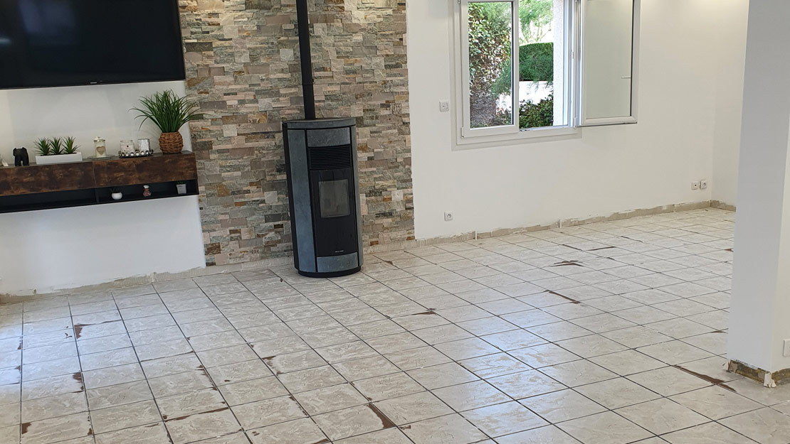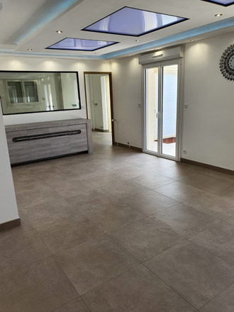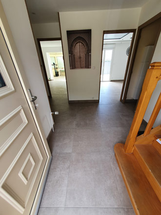 Ici nous avons posé un carrelage 60x60cm sur le carrelage existant. La bonne planéité du sol nous a permis de pouvoir le coller directement sur l'ancien carrelage après avoir dépoli le support et appliqué un primaire d'accrochage. Quand la hauteur sous les portes nous le permet il est plus aisé et moins couteux de procéder ainsi.