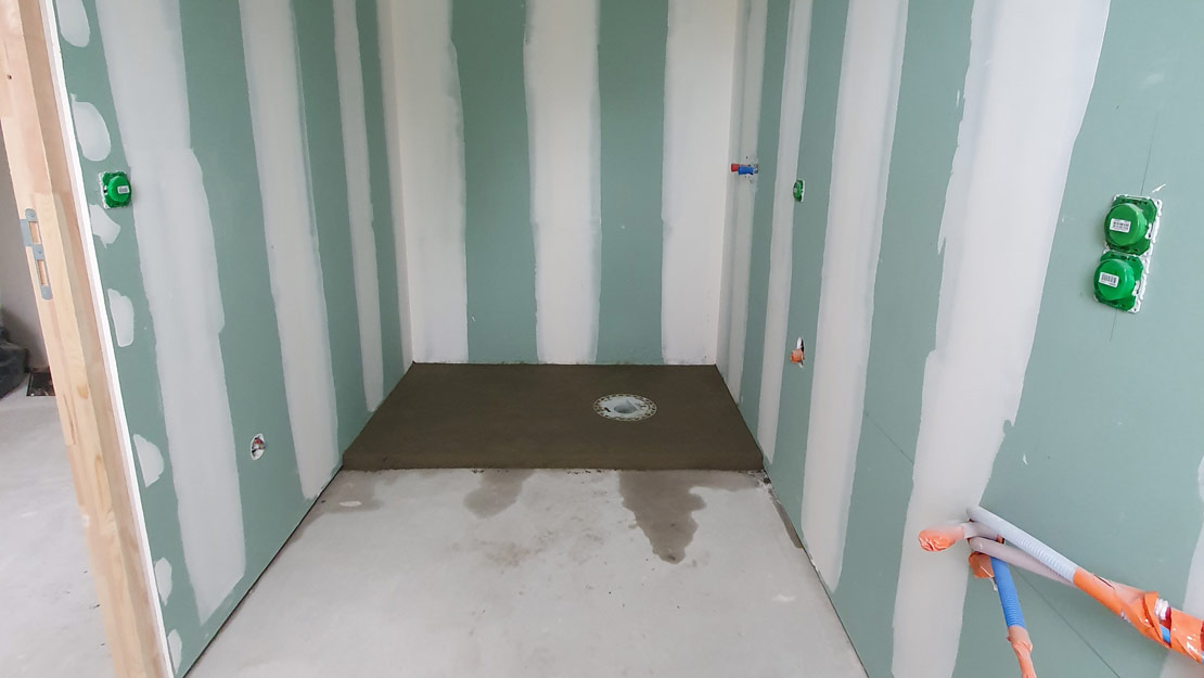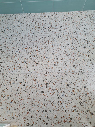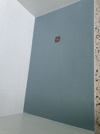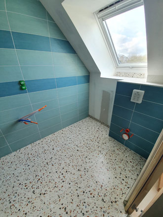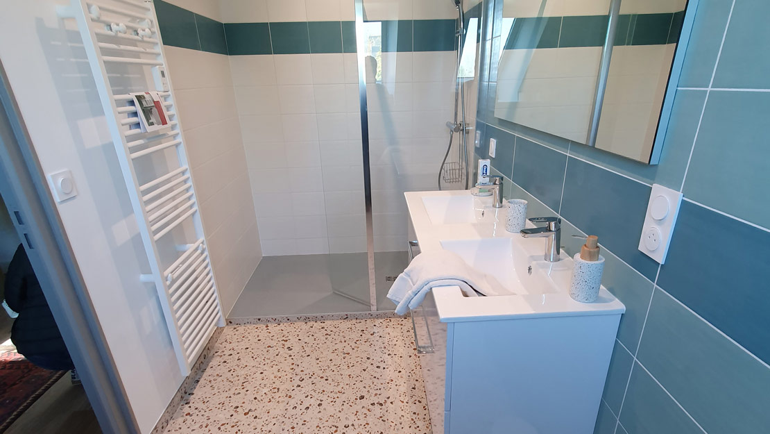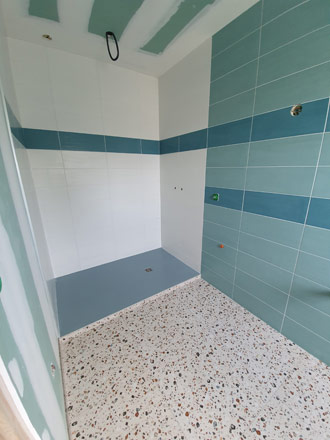 Dans cette salle d'eau nous avons créé une douche à l'italienne en mosaïque hexagonale. Nous avons utilisé des produits époxy pour assurer la longévité de cette douche. Le sol en carrelage 60x60cm imitation Terrazzo ajoute une vraie note de couleur dans cette salle d'eau vitaminée !