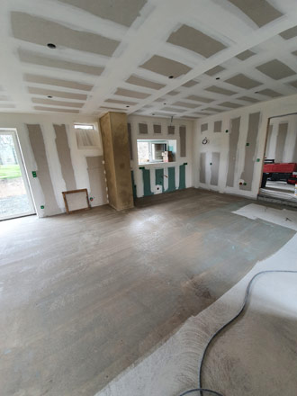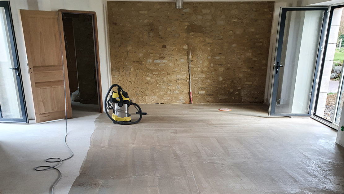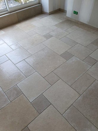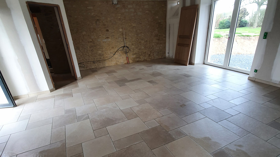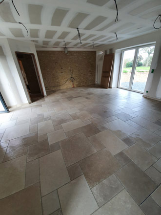 Dans cette pièce de vie nous avons réalisé la pose d'un carrelage multiformats en 5 formats différents ! Ce carrelage en grès imite parfaitement la pierre grâce à son aspect et ses nuances. Il procure tous les avantages esthétiques de la pierre sans s'affranchir des inconvenants. De plus, il apporte une touche d'authenticité complètement en adéquation avec les murs en pierres de cette très belle bâtisse !