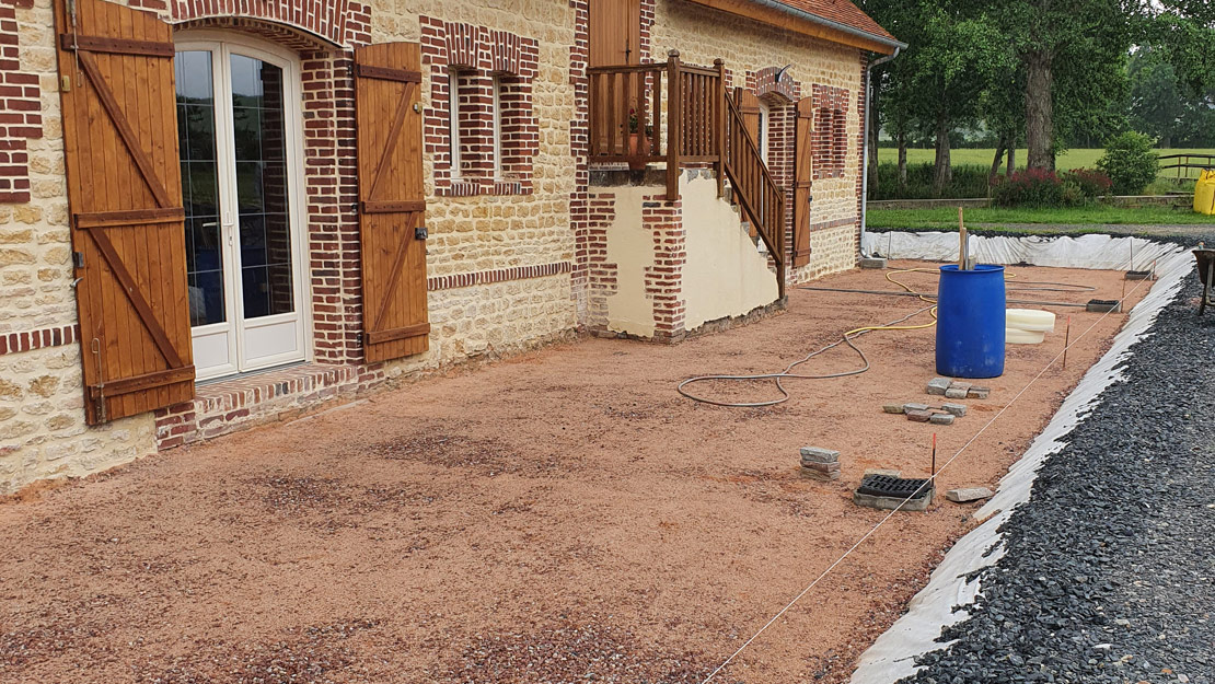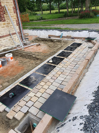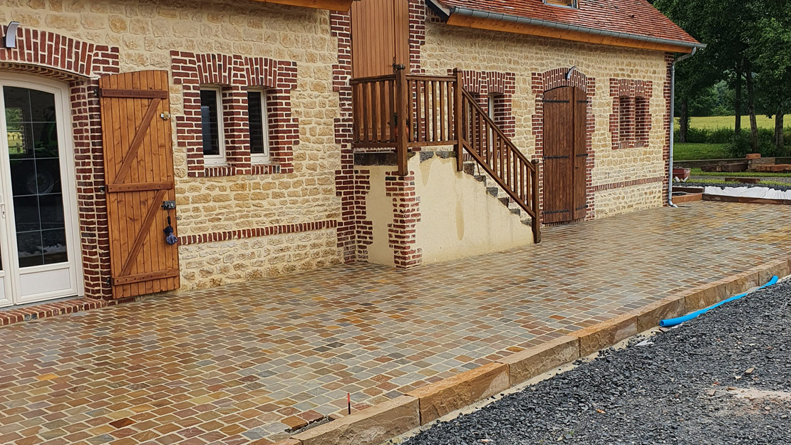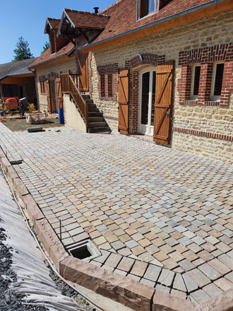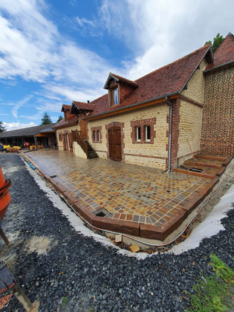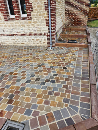 Sur ce chantier nous avons posé des pavés en provenance d'Inde au format 14x14cm. La différence d'épaisseur de ce produit nous a contraint d'employer la pose traditionnelle (sur chape fraiche). Ainsi nous avons pu régler à notre convenance la planéité et conserver notre pente. Nous avons réalisé des caniveaux en pavés en rive de la terrasse pour évacuer les eaux de pluies. Des marches et des bordures ont étaient réalisé avec le même grès pour être en accord avec le pavé et le style de cette maison Normande.