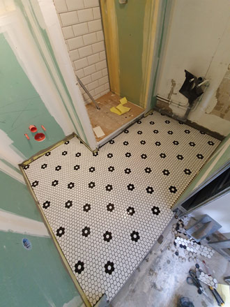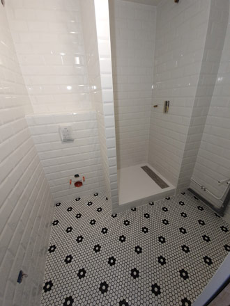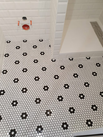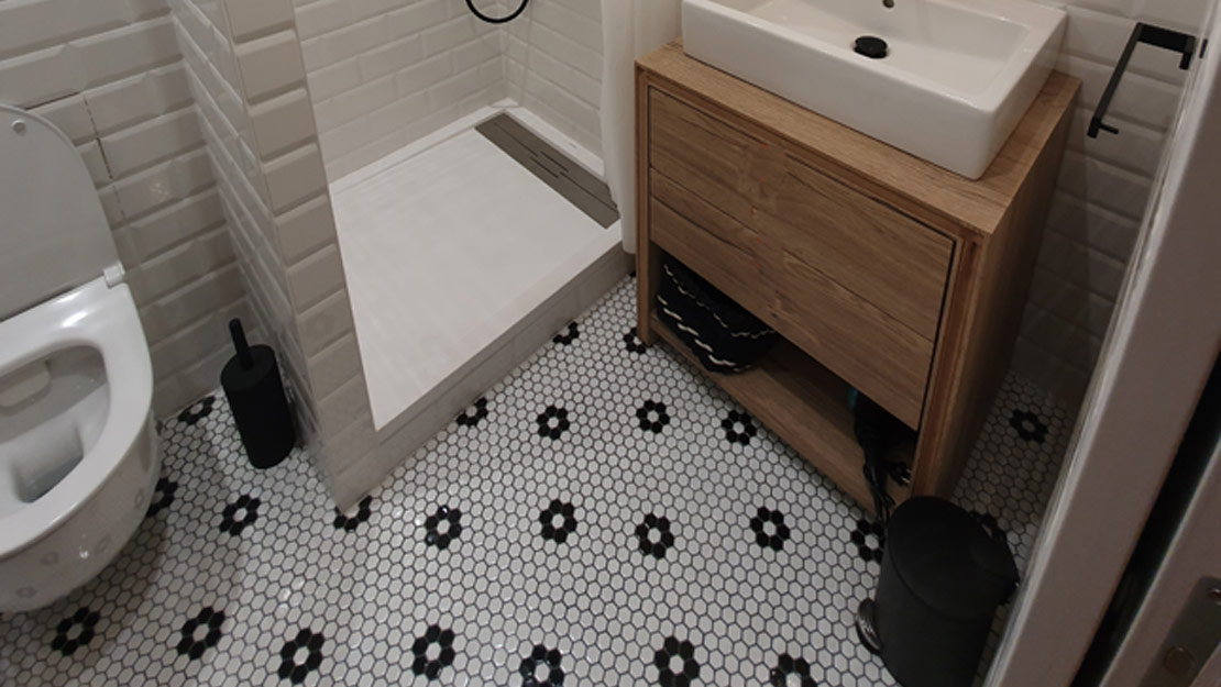 Cette salle de douche sans fenêtre avait besoin d'un revêtement clair. Cette faïence métro est parfaitement adaptée. Elle apporte de la clarté et du relief à cette petite pièce. Le sol en mosaïque hexagonale noire et blanche s'accorde parfaitement avec la faïence métro pour un résultat épuré !