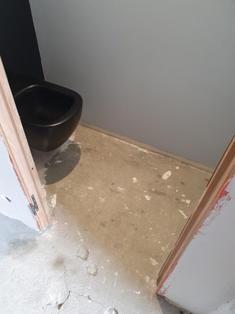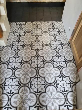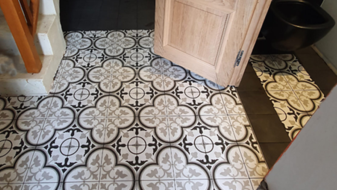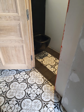 Dans ce petit dégagement et WC nous avons posé un carrelage 20x20cm imitation carreaux de ciment. Il s'agit d'un grès qui imite le carreau de ciment, vous profitez donc de tous les avantages du carreau de ciment sans avoir à vous soucier de l'entretien compliqué et des traitements annuels que nécessite le véritable carreau de ciment.